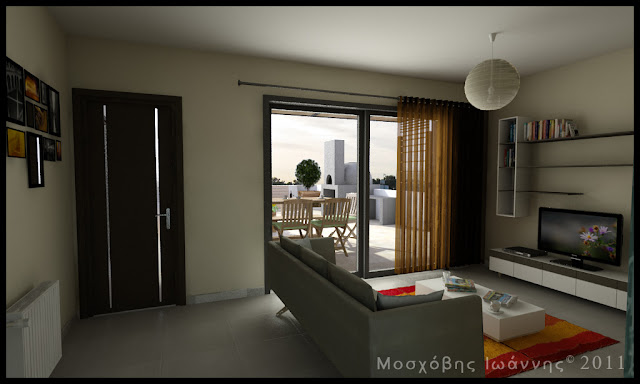 Μπαίνοντας στο χώρο, συναντάμε το καθιστικό με τη σύνθεση της τηλεόρασης, ενώ δεξιά τοποθετείται το γραφείο. Προχωρώντας στο εσωτερικό του σπιτιού, βρίσκεται η κουζίνα με το τραπέζι της. Επιδιώκοντας να διαχωρίσω τους χώρους (σαλόνι - κουζίνα), κατασκεύασα δύο φύλλα από Plexiglas, επάνω στα οποία τύπωσα τις λέξεις "Καλημέρα" και "Καλησπέρα" σε πέντε διαφορετικές γλώσσες. Με αυτόν τον τρόπο πέτυχα το φυσικό διαχωρισμό των δύο χώρων, δίνοντας βέβαια τη δυνατότητα της οπτικής τους επαφής, καθώς και του φυσικού τους φωτισμού.